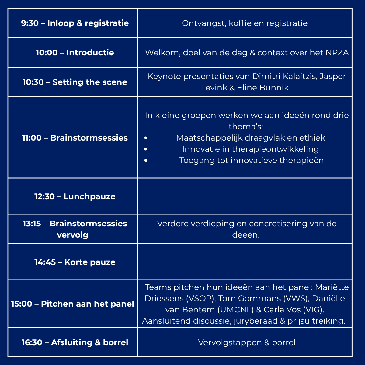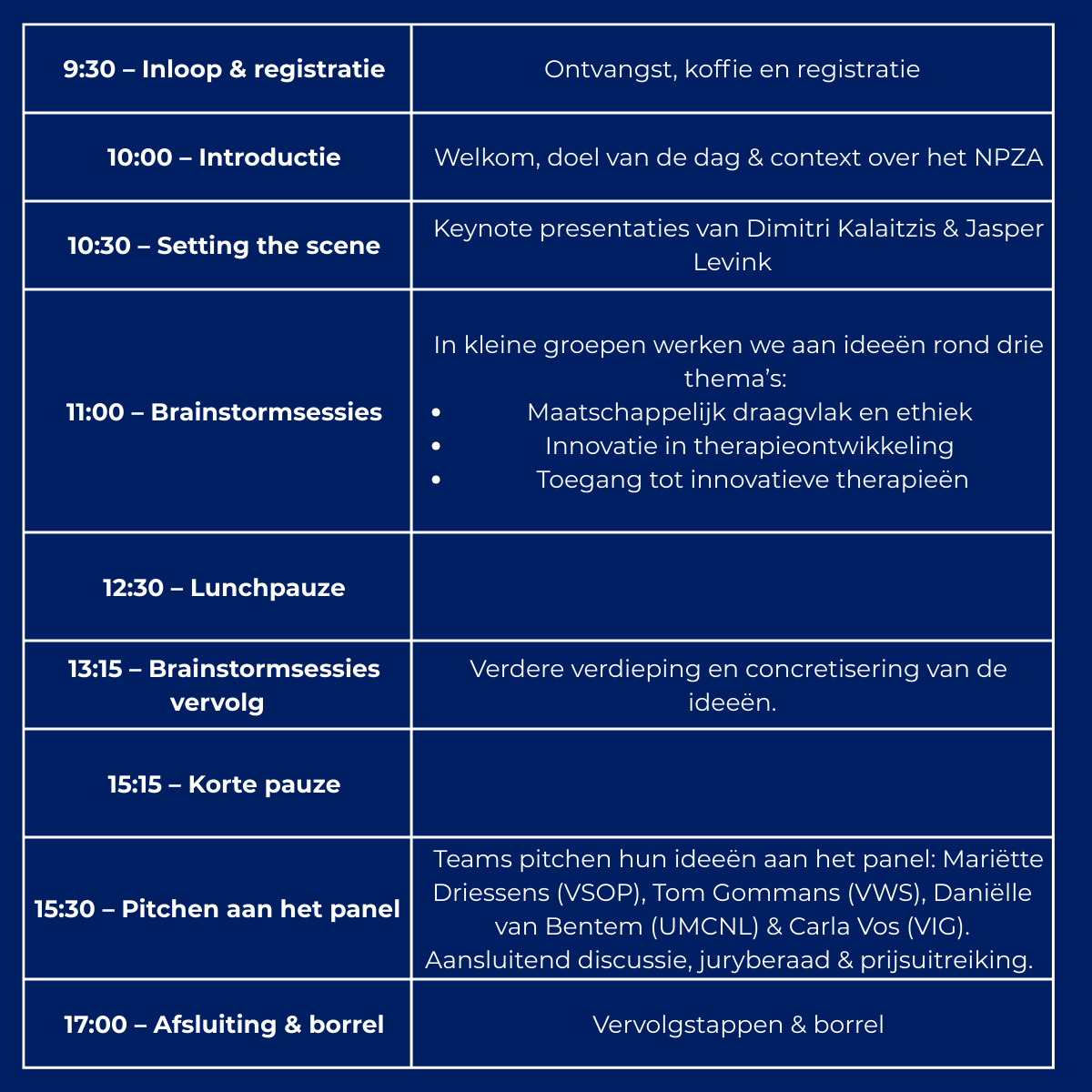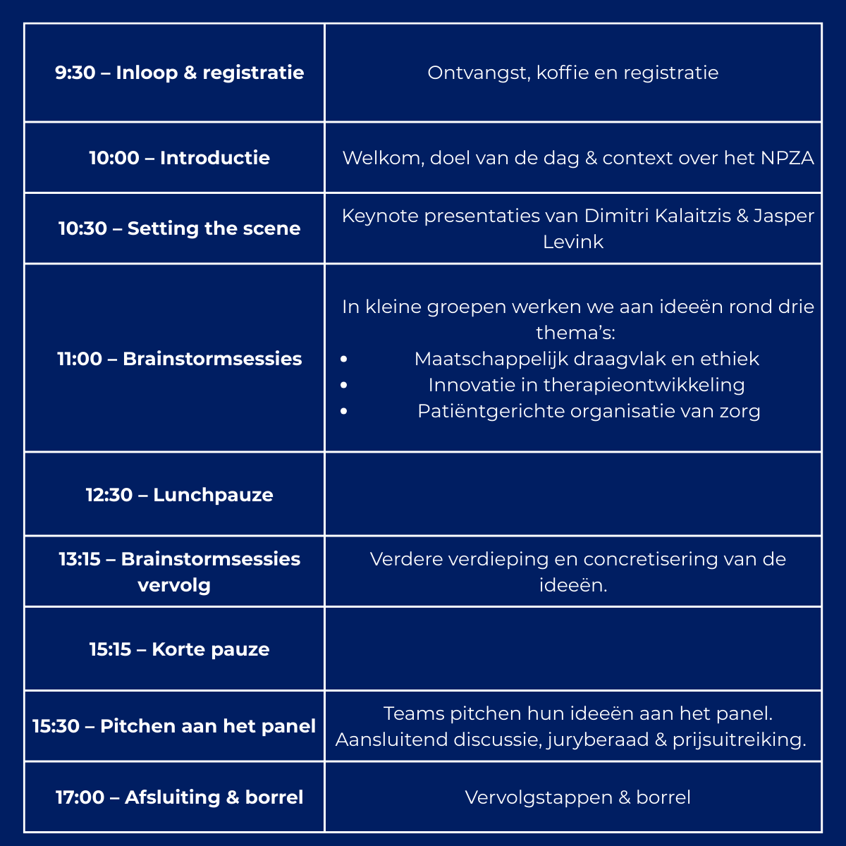 Van patiëntvertegenwoordigers tot onderzoekers, van ondernemers tot beleidsmakers: samen werken we aan oplossingen die écht het verschil maken. De meest kansrijke ideeën en aanbevelingen worden na afloop aangeboden aan het Ministerie van VWS.
